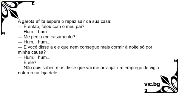 — Não quis saber, mas disse que vai me arranjar um emprego de vigia noturno na loja dele.
