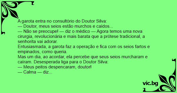 — Não se preocupe! — diz o médico — Agora temos uma nova cirurgia, revolucionária e mais barata que a prótese tradicional, a senhorita vai adorar.