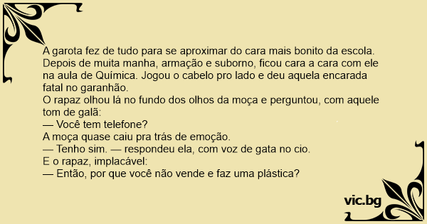 A garota fez de tudo para se aproximar do cara mais bonito da escola. Depois de muita manha, armação e suborno, ficou cara a cara com ele na aula de Química. Jogou o cabelo pro lado e deu aquela encarada fatal no garanhão.