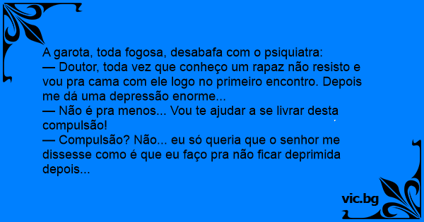 — Doutor, toda vez que conheço um rapaz não resisto e vou pra cama com ele logo no primeiro encontro. Depois me dá uma depressão enorme...