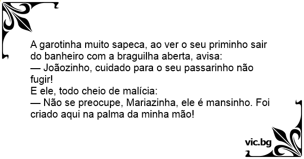 A garotinha muito sapeca, ao ver o seu priminho sair do banheiro com a braguilha aberta, avisa:
