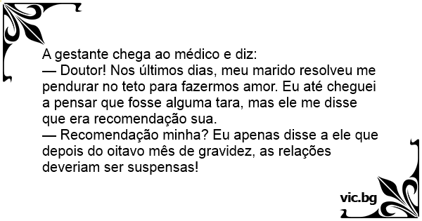 — Recomendação minha? Eu apenas disse a ele que depois do oitavo mês de gravidez, as relações deveriam ser suspensas!