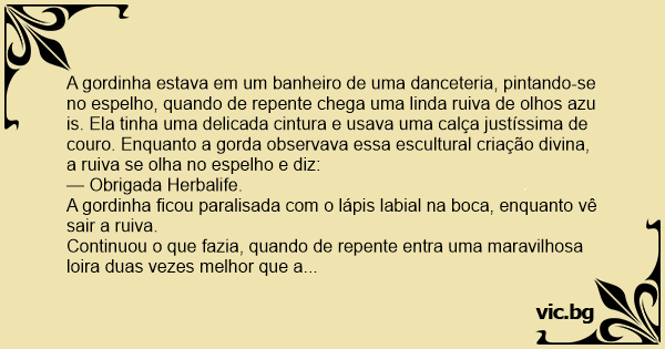 A gordinha estava em um banheiro de uma danceteria, pintando-se no espelho, quando de repente chega uma linda ruiva de olhos azu is. Ela tinha uma delicada cintura e usava uma calça justíssima de couro. Enquanto a gorda observava essa escultural criação divina, a ruiva se olha no espelho e diz: