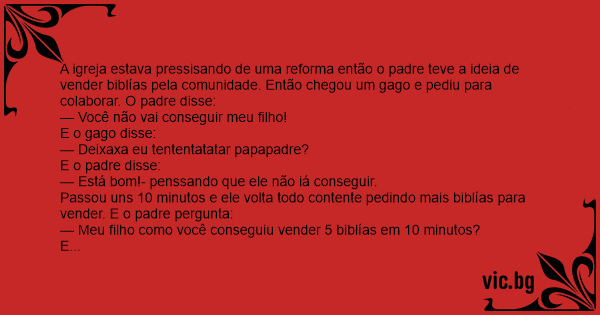 A igreja estava pressisando de uma reforma então o padre teve a ideia de vender biblías pela comunidade. Então chegou um gago e pediu para colaborar. O padre disse: