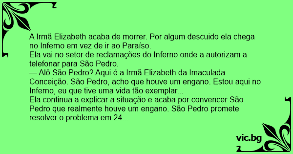 — Alô São Pedro? Aqui é a Irmã Elizabeth da Imaculada Conceição. São Pedro, acho que houve um engano. Estou aqui no Inferno, eu que tive uma vida tão exemplar...