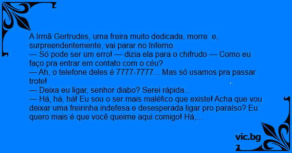 A Irmã aguardou ansiosa, perambulando horrorizada pelo Inferno. No outro dia, São Pedro ainda não havia mandado ninguém. Então ela ligou novamente: