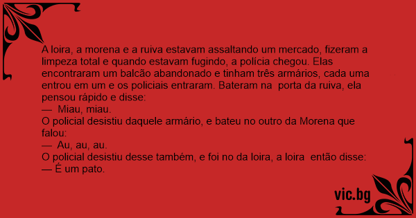 A loira, a morena e a ruiva estavam assaltando um mercado, fizeram a limpeza total e quando estavam fugindo, a polícia chegou. Elas encontraram um balcão abandonado e tinham três armários, cada uma entrou em um e os policiais entraram. Bateram na porta da ruiva, ela pensou rápido e disse: