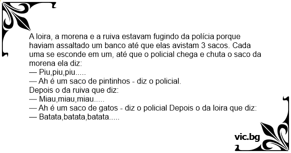 A loira, a morena e a ruiva estavam fugindo da polícia porque haviam assaltado um banco até que elas avistam 3 sacos. Cada uma se esconde em um, até que o policial chega e chuta o saco da morena ela diz: