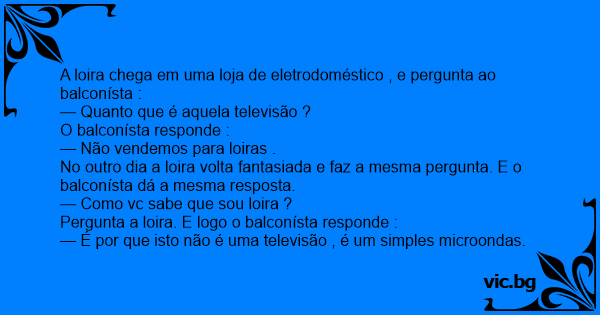Uma loira chega na loja e pergumta: — Quanto custa essa televisão? O vendedor avisa: — Não vendo televisões para loiras. A loira pergunta: — Por que não? — Eu já disse não vendo televisões para...