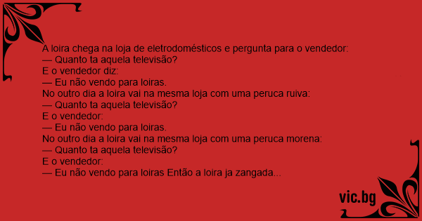 Uma, loira entrou em loja de eletrodomestico e falou: Vendedor me ve essa televisao. E o vendedor respondeu: Eu nao vendo para loiras. No outro dia ela voltou la de novo com uma peruca, ruiva e...