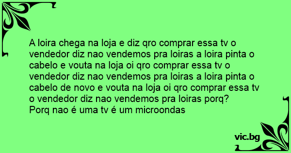 Uma loira foi a loja e disse quero comprar essa televisão. O vendedor disse: — Não vendemos para loira. Outro dia pois uma piruca preta, e foi denovo e disse: — Quero comprar essa televisão. — Não...