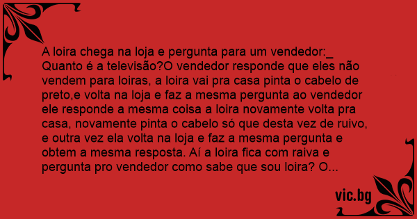 Um dia uma loira foi numa loja conprar uma televisao e pergunta para o comerciante: Quantovale essa tv???? O comerciante responde não vendemos!!! Ai a lora foi en casa e pintou o cabelo de ruivo...