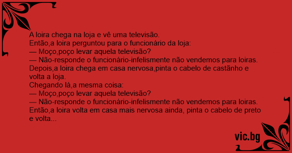 Uma loira foi em uma loja comprar uma tv. Chegando lá ela falou para o vendedor: — - EU quero comprar essa tv. E o vendedor disse: — - Não vendemos pra loiras. Ela tinge o cabelo de preto e volta...