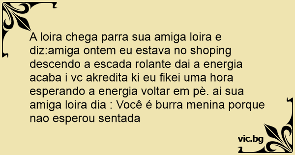 A loira chega parra sua amiga loira e diz:amiga ontem eu estava no shoping descendo a escada rolante dai a energia acaba i vc akredita ki eu fikei uma hоrа esperando a energia voltar em pè. ai sua amiga loira dia : Você é burra menina porque nao esperou sentada