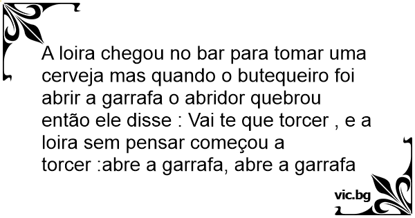 A loira chegou no bar para tomar uma cerveja mas quando o butequeiro foi abrir a garrafa o abridor quebrou então ele disse : Vai te que torcer , e a loira sem pensar começou a torcer :abre a garrafa, abre a garrafa