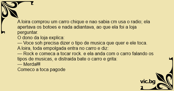 A loira comprou um carro chique e nao sabia cm usa o radio; ela apertava os botoes e nada adiantava, ao que ela foi a loja perguntar.