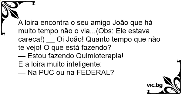 A loira encontra o seu amigo João que há muito tempo não o via...(Obs: Ele estava careca!) __ Oi João! Quanto tempo que não te vejo! O que está fazendo?