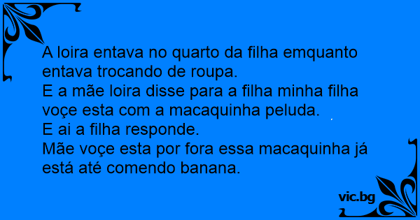 Uma vez, uma mae,ao ver a sua filha sair do banho, ele vai ate o quartu da filha e ao entrar e ela ve a manina pelada e diz: — Nossa filha, que "macaca" peluda! A filha rapidamente a responde: —...