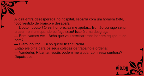— Doutor, doutor! O senhor precisa me ajudar... Eu não consigo sentir prazer nenhum quando eu faço sеxо! Isso é uma desgraça!