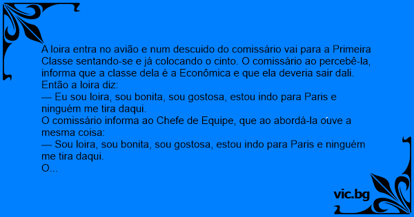Uma loira ia viajar para EUA, chegando no avião a mesma sentou-se na primeira classe, em seguida a comissária dirigiu-se a ela e pediu educadamente, para que a ela se fosse para a classe comercial....