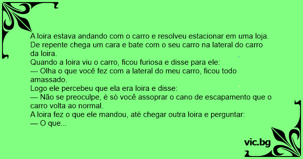 A loira para o caro no supermercado e quando volta, nota um amassado na lateral do carro, nisso passa um cara e diz o seguinde?: — Assopra no escapamento que desamassa!! Então a loira começa a...