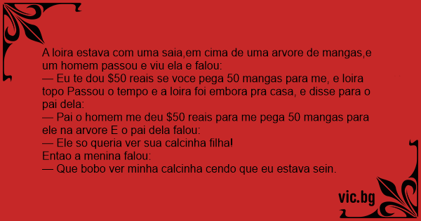— Eu te dou $50 reais se voce pega 50 mangas para me, e loira topo Passou o tempo e a loira foi embora pra casa, e disse para o pai dela: