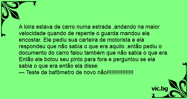 A loira estava de carro numa estrada ,andando na maior velocidade quando de repente o guarda mandou ela encostar. Ele pediu sua carteira de motorista e ela respondeu que não sabia o que era aquilo ,então pediu o documento do carro falou também que não sabia o que era. Então ele botou seu pinto para fora e perguntou se ela sabia o que era então ela disse: