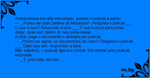 — _ Posso ver sua Carteira de Motorista?- Pergunta o policial ___ O que é isso? Responde a loira ___ É sua licença para poder dirigir, deve estr dentro do seu porta-malas.