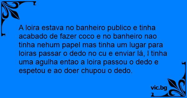 A loira estava no banheiro publico e tinha acabado de fazer coco e no banheiro nao tinha nehum papel mas tinha um lugar para loiras passar o dedo no cu e enviar lá, l tinha uma agulha entao a loira passou o dedo e espetou e ao doer chupou o dedo.