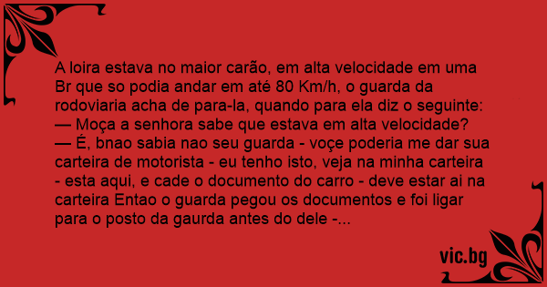 — É, bnao sabia nao seu guarda - voçe poderia me dar sua carteira de motorista - eu tenho isto, veja na minha carteira - esta aqui, e cade o documento do carro - deve estar ai na carteira Entao o guarda pegou os documentos e foi ligar para o posto da gaurda antes do dele - voces ai nao viram uma loira em alta velocidade - cara sabe o que vc faz, arreia as calças e mostra as coisas a ela O cara sem entender, o porque daquilo, chegou perto da loira, abriu o ziper e colocou as coisas para fora, a loira olhou e retrucou: