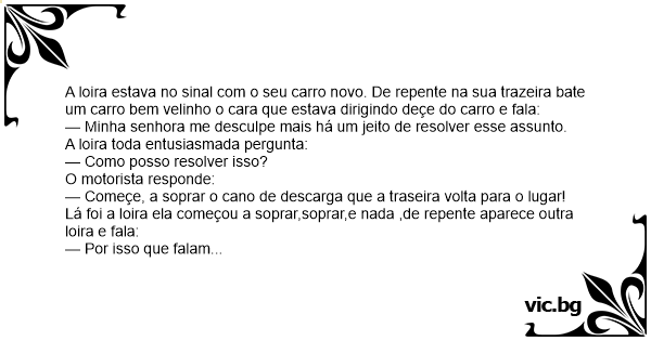 A loira para o caro no supermercado e quando volta, nota um amassado na lateral do carro, nisso passa um cara e diz o seguinde?: — Assopra no escapamento que desamassa!! Então a loira começa a...