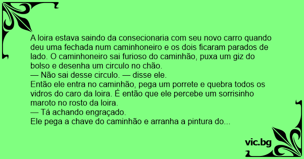 A loira estava saindo da consecionaria com seu novo carro quando deu uma fechada num caminhoneiro e os dois ficaram parados de lado. O caminhoneiro sai furioso do caminhão, puxa um giz do bolso e desenha um circulo no chão.