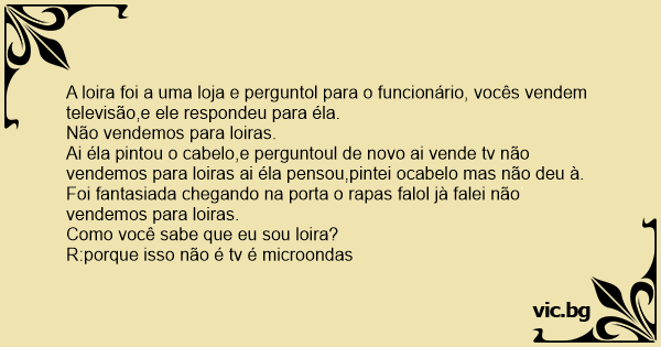 Uma loira chega em uma certa loja e chama o vendedor!!! — Vendedor eu quero comprar aquela televisao ali!!! O vendedor respode!! — Minha senhora nao vendemoas pra loiras A loira foi em casa pintou...