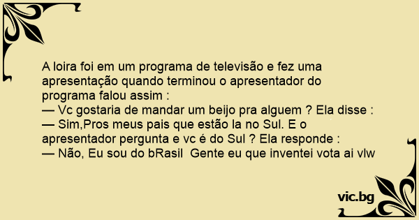— Sim,Pros meus pais que estão la no Sul. E o apresentador pergunta e vc é do Sul ? Ela responde :