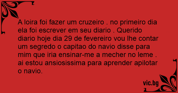 A loira foi fazer um cruzeiro . no primeiro dia ela foi escrever em seu diario . Querido diario hoje dia 29 de fevereiro vou lhe contar um segredo o capitao do navio disse para mim que iria ensinar-me a mecher no leme . ai estou ansiosissima para aprender apilotar o navio.