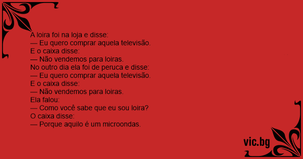 Um dia uma loira foi numa loja conprar uma televisao e pergunta para o comerciante: Quantovale essa tv???? O comerciante responde não vendemos!!! Ai a lora foi en casa e pintou o cabelo de ruivo...