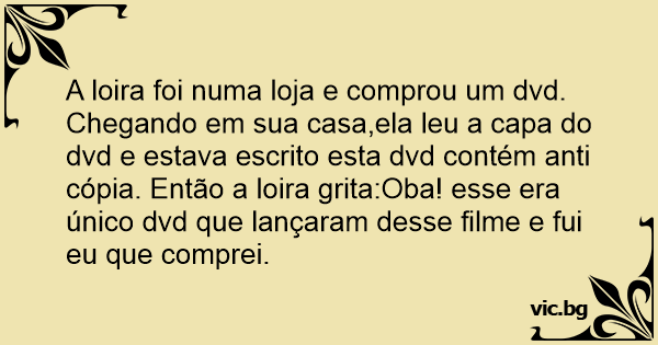 A loira foi numa loja e comprou um dvd. Chegando em sua casa,ela leu a capa do dvd e estava escrito esta dvd contém anti cópia. Então a loira grita:Oba! esse era único dvd que lançaram desse filme e fui eu que comprei.
