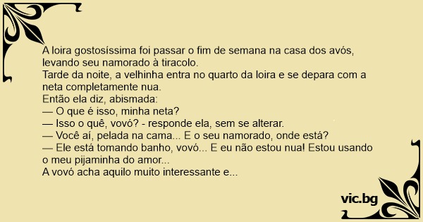 — Isso o quê, vovó? - responde ela, sem se alterar.
