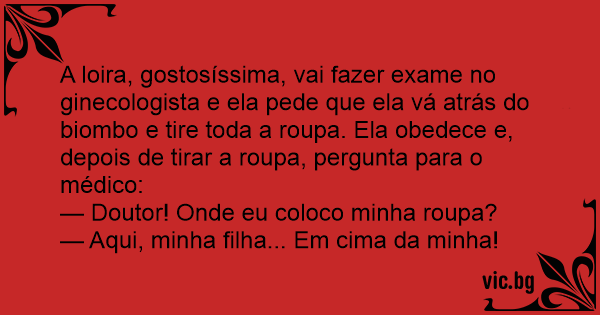 A loira, gostosíssima, vai fazer exame no ginecologista e ela pede que ela vá atrás do biombo e tire toda a roupa. Ela obedece e, depois de tirar a roupa, pergunta para o médico: