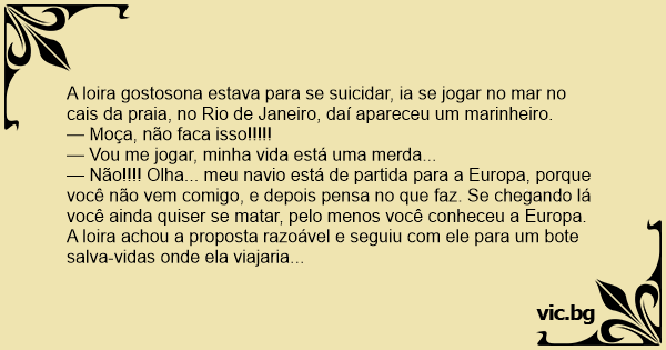 A loira gostosona estava para se suicidar, ia se jogar no mar no cais da praia, no Rio de Janeiro, daí apareceu um marinheiro.