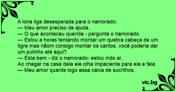 A loira Patrícia liga para o namorado Maurício, desesperada: — Maurício, comprei um quebra-cabeça e não encontro os cantos, não acho o começo, aí meu deus, me ajuda. — Calma, Patrícia. Que figura...