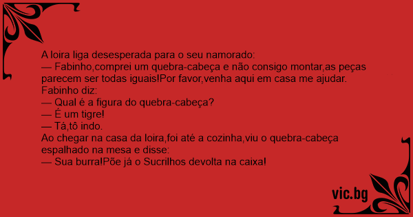A loira Patrícia liga para o namorado Maurício, desesperada: — Maurício, comprei um quebra-cabeça e não encontro os cantos, não acho o começo, aí meu deus, me ajuda. — Calma, Patrícia. Que figura...