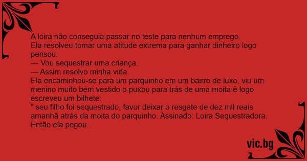 " seu filho foi sequestrado, favor deixar o resgate de dez mil reais amanhã atrás da moita do parquinho. Assinado: Loira Sequestradora.