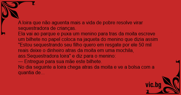 No dia seguinte a loira chega atras da moita e ve a bolsa com a quantia de dinheiro que ela pediu e um outro bilhete dizendo "Aqui está o seu dinheiro´, só não entendo como uma loira faz uma coisa dessas com a outra".