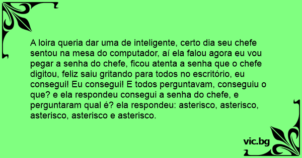 A loira queria dar uma de inteligente, certo dia seu chefe sentou na mesa do computador, aí ela falou agora eu vou pegar a senha do chefe, ficou atenta a senha que o chefe digitou, feliz saiu gritando para todos no escritório, eu consegui! Eu consegui! E todos perguntavam, conseguiu o que? e ela respondeu consegui a senha do chefe, e perguntaram qual é? ela respondeu: asterisco, asterisco, asterisco, asterisco e asterisco.