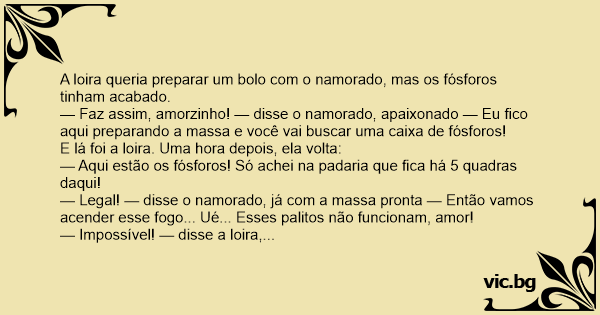 — Faz assim, amorzinho! — disse o namorado, apaixonado — Eu fico aqui preparando a маssа e você vai buscar uma caixa de fósforos!