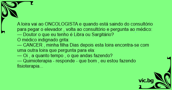 A loira vai ao ONCOLOGISTA e quando está saindo do consultório para pegar o elevador , volta ao consultório e pergunta ao médico: