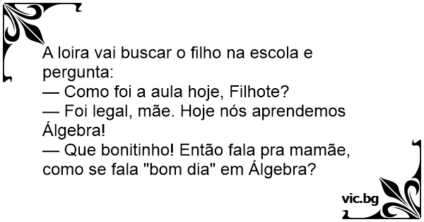 A loira vai buscar o filho na escola e pergunta: — Como foi a aula hoje, Filhote? — Foi legal, mãe. Hoje nós aprendemos Álgebra! — Que bonitinho! Então fala pra mamãe, como se fala "bom dia" em Álgebra?