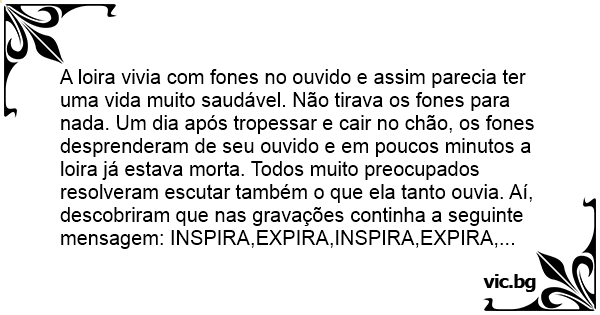 A loira vivia com fones no ouvido e assim parecia ter uma vida muito saudável. Não tirava os fones para nada. Um dia após tropessar e cair no chão, os fones desprenderam de seu ouvido e em poucos minutos a loira já estava morta. Todos muito preocupados resolveram escutar também o que ela tanto ouvia. Aí, descobriram que nas gravações continha a seguinte mensagem: INSPIRA,EXPIRA,INSPIRA,EXPIRA,...