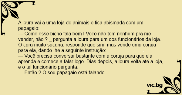 — Você precisa conversar bastante com a coruja para que ela aprenda e comece a falar logo. Dias depois, a loura volta até a loja, e o tal funcionário pergunta: